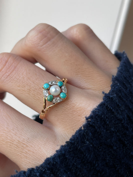 Antique turquoise pearl and diamond target cluster ring