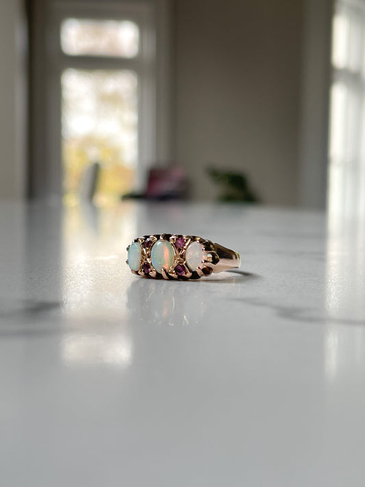 Antique opal and ruby boat ring on 9ct gold