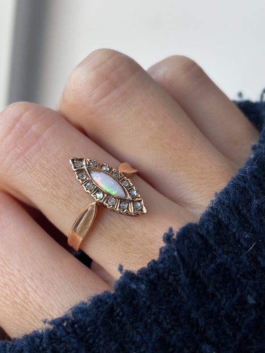 Victorian opal and diamond navette ring on 9ct gold