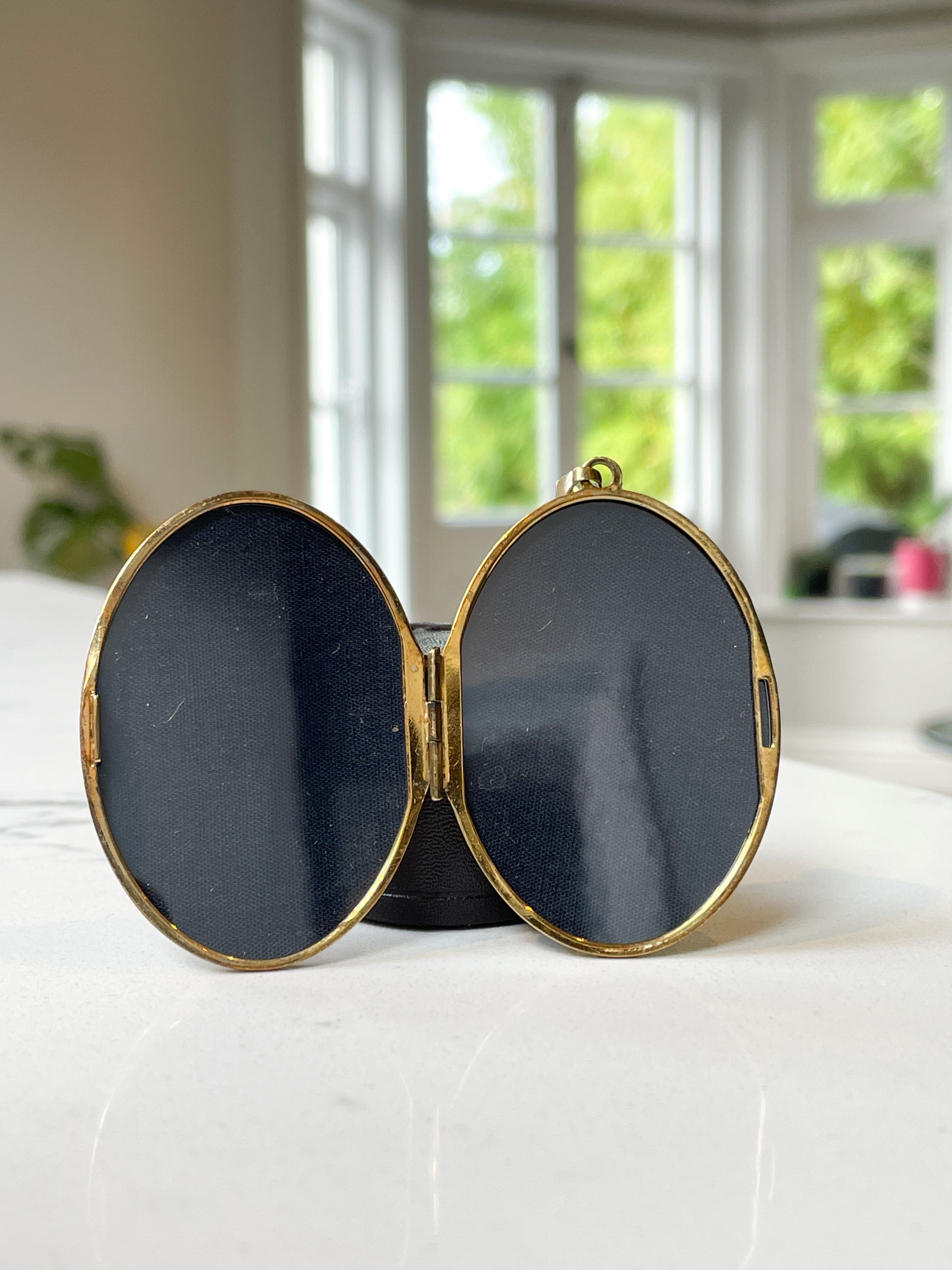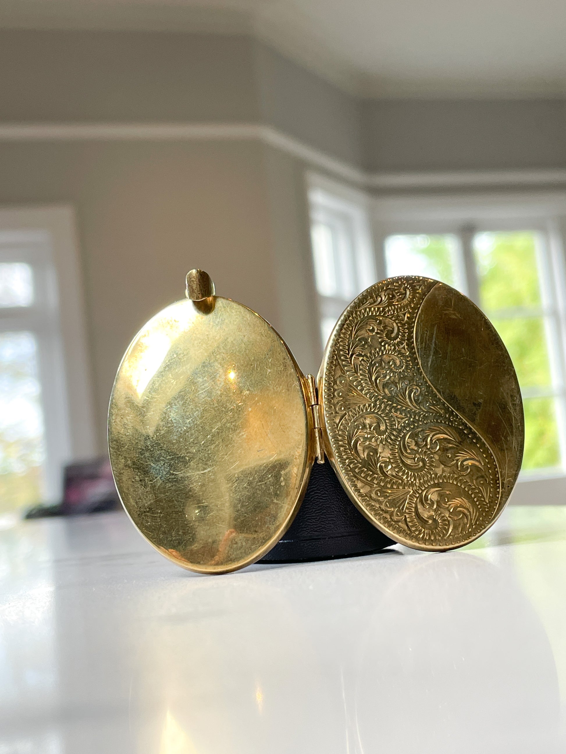 The front of the locket is domed and engraved with a floral design with a patterned edge, and a rope twist style braiding along the locket edges. The open and shut locket opens to reveal to compartments, one retaining the photo shield.