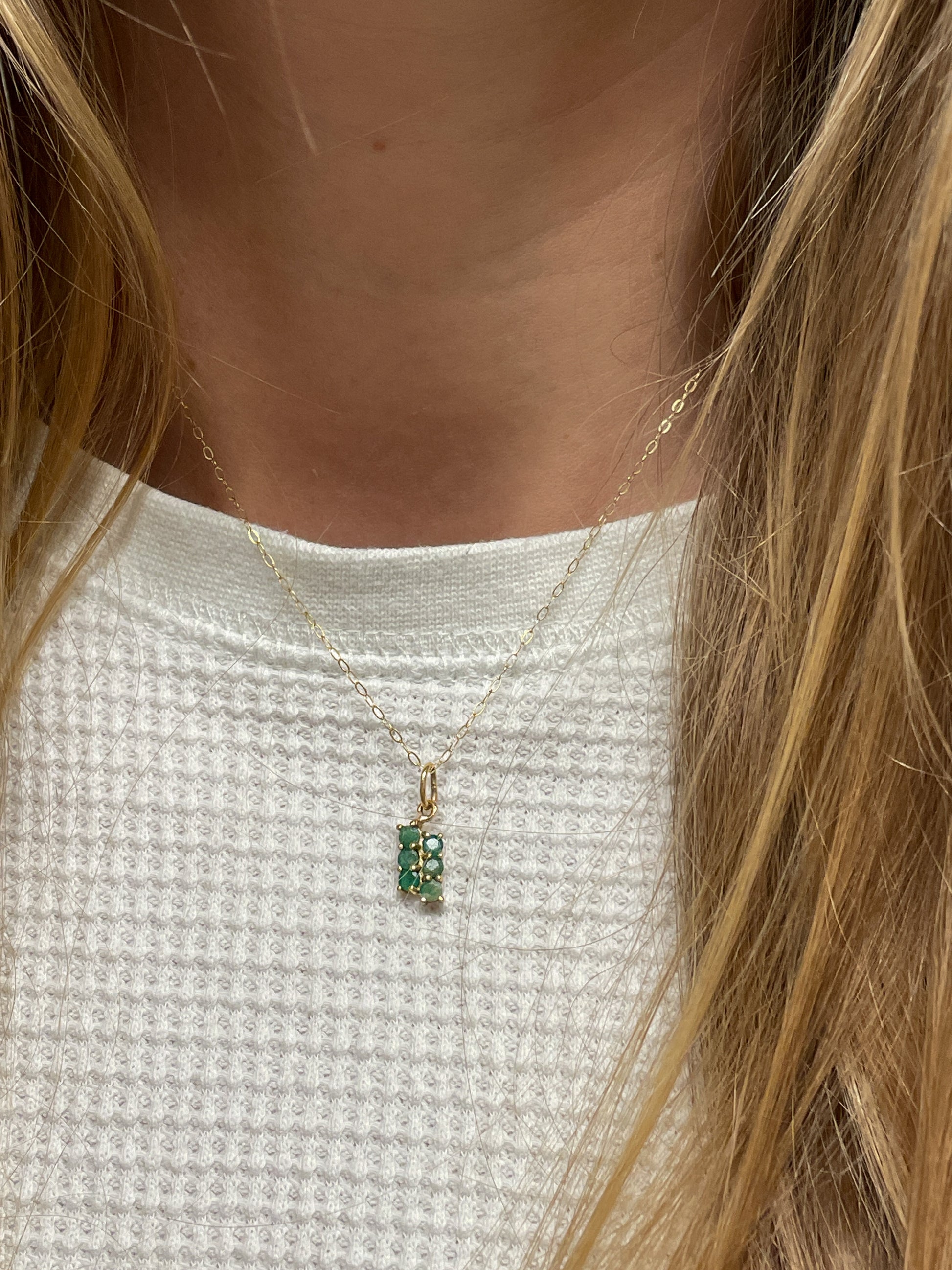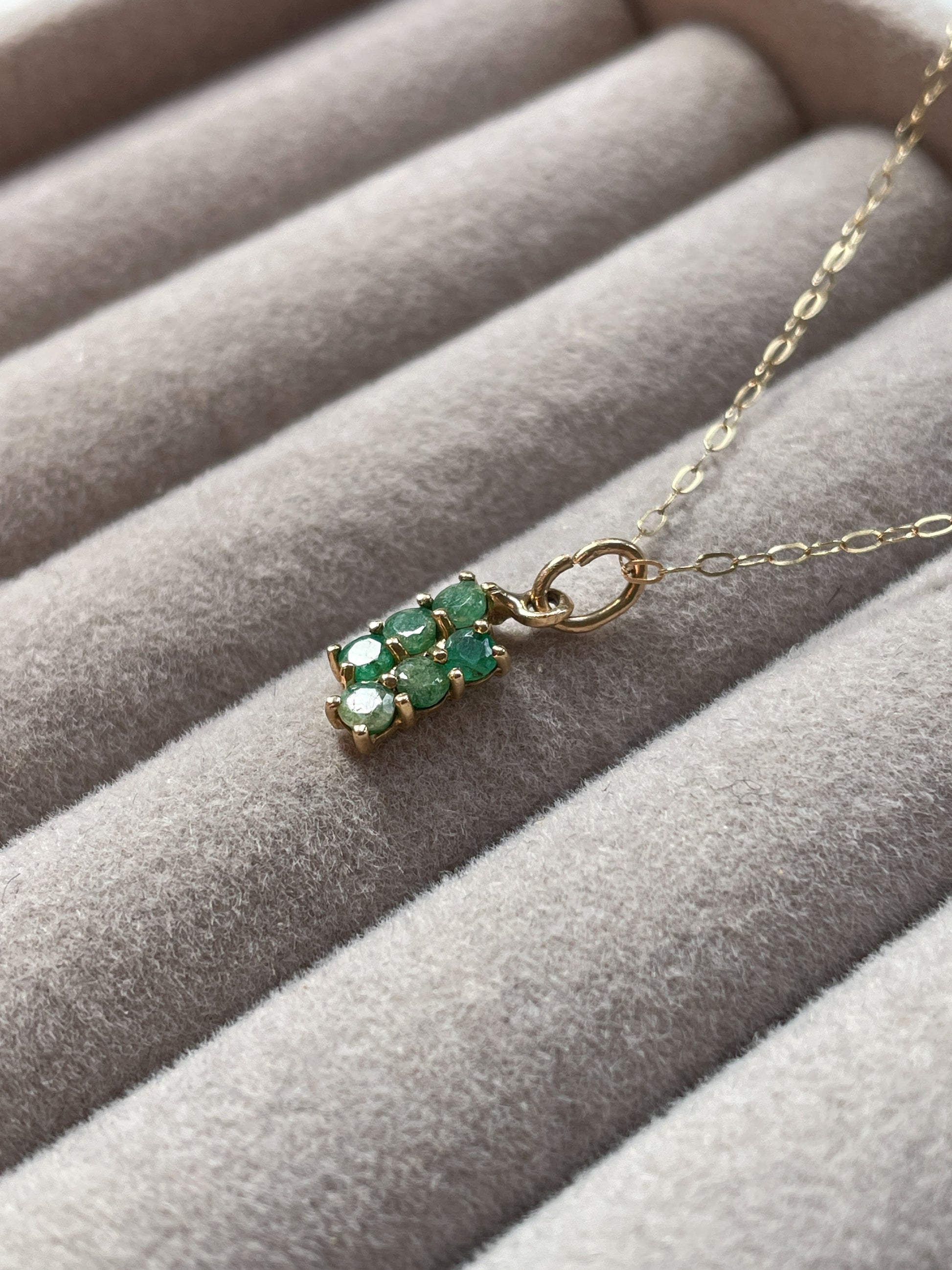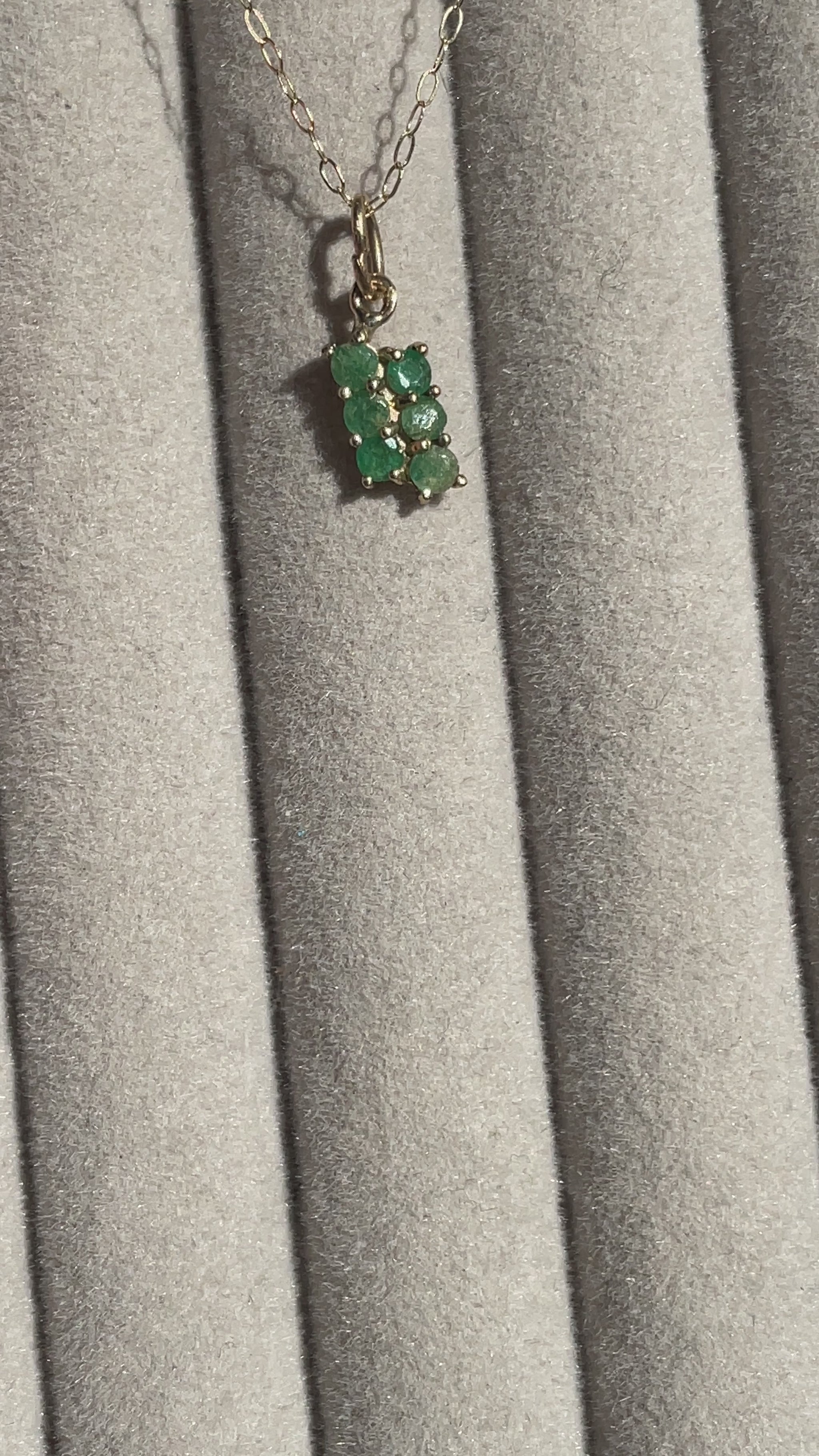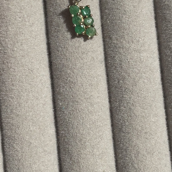 This pendant features 6 emerald stones which have typical inclusions, quite heavy in the bottom right stones. No hallmarks seen but likely to be vintage in age due to the style and condition of stones.