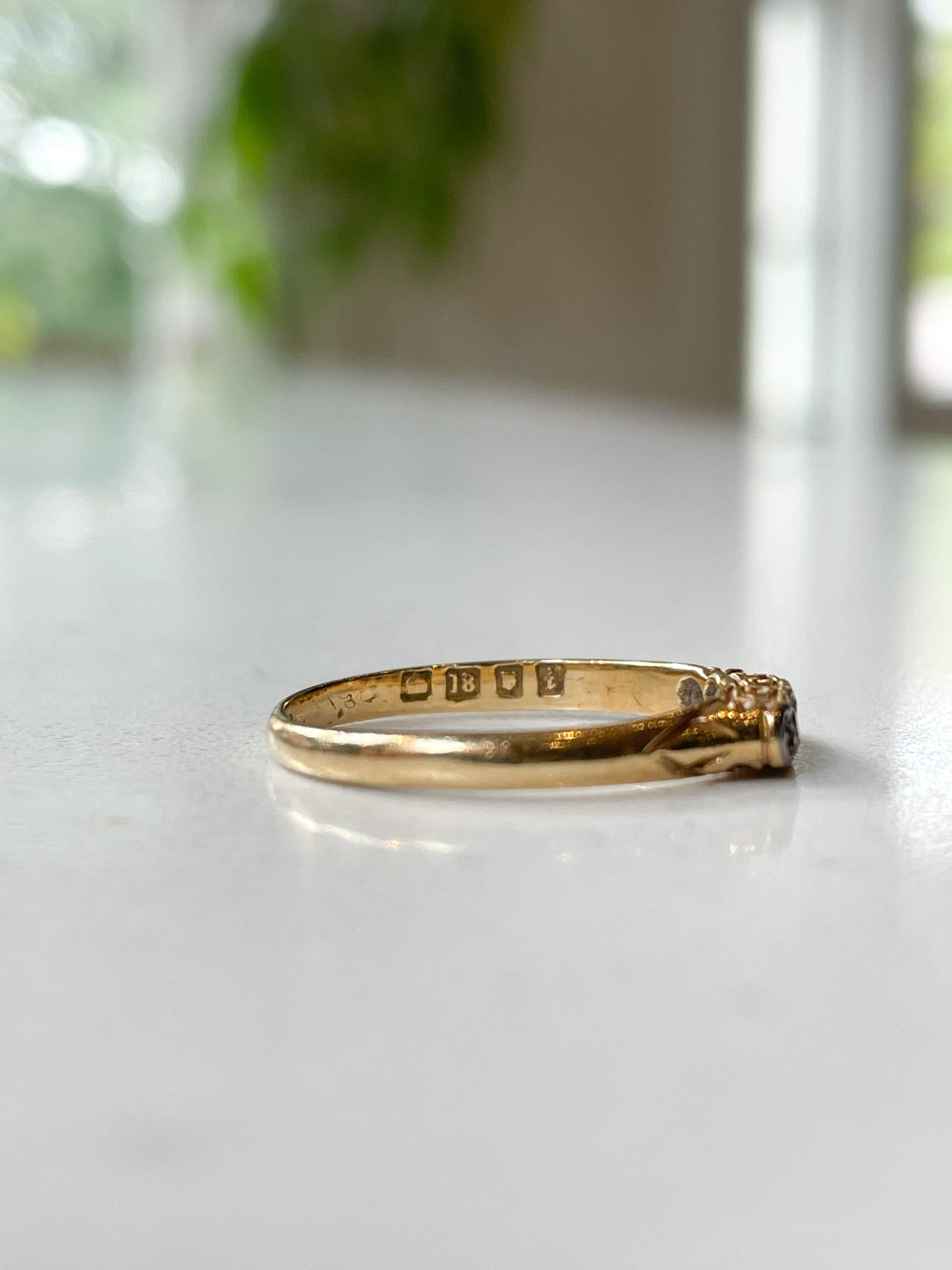 This antique piece is crafted in 18ct gold and features 5 graduating diamond stones, in a raised carved gallery. Set in engraved shoulders and with each stone in a bezel style setting.