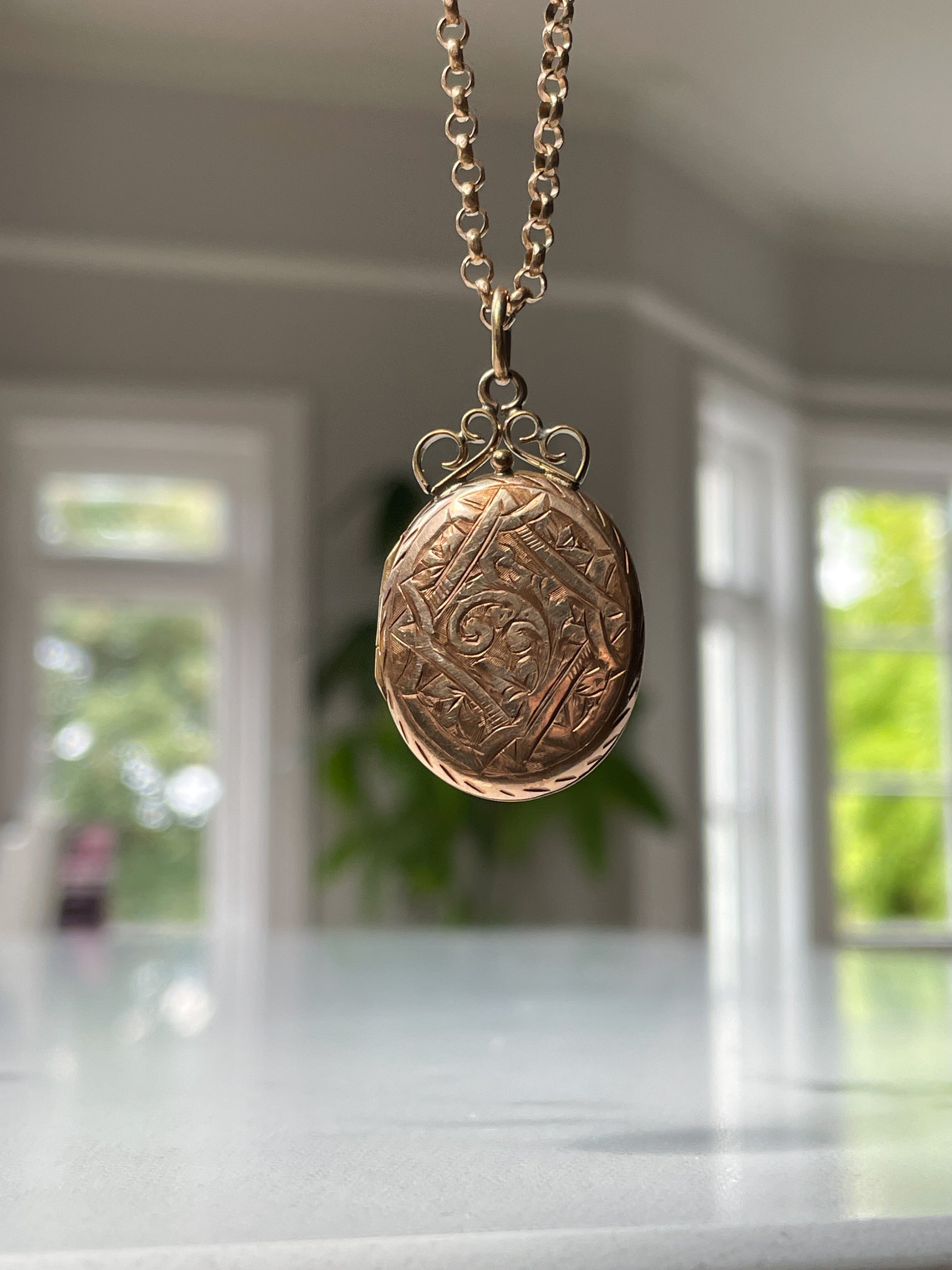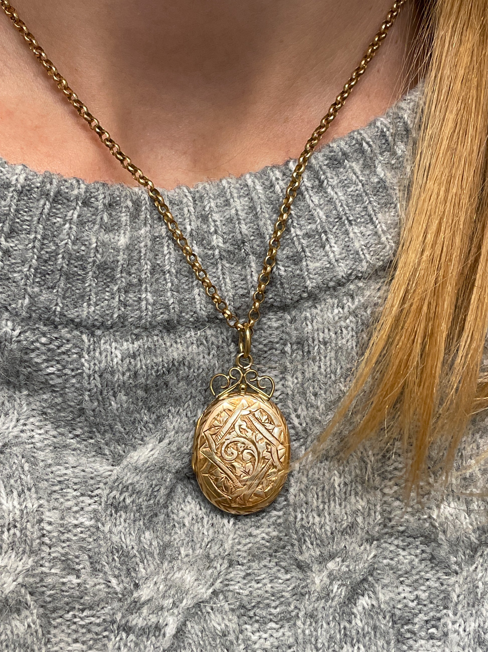 This locket is beautifully detailed with a mix of geometric and foliate design, with a patterned bail for added interest.