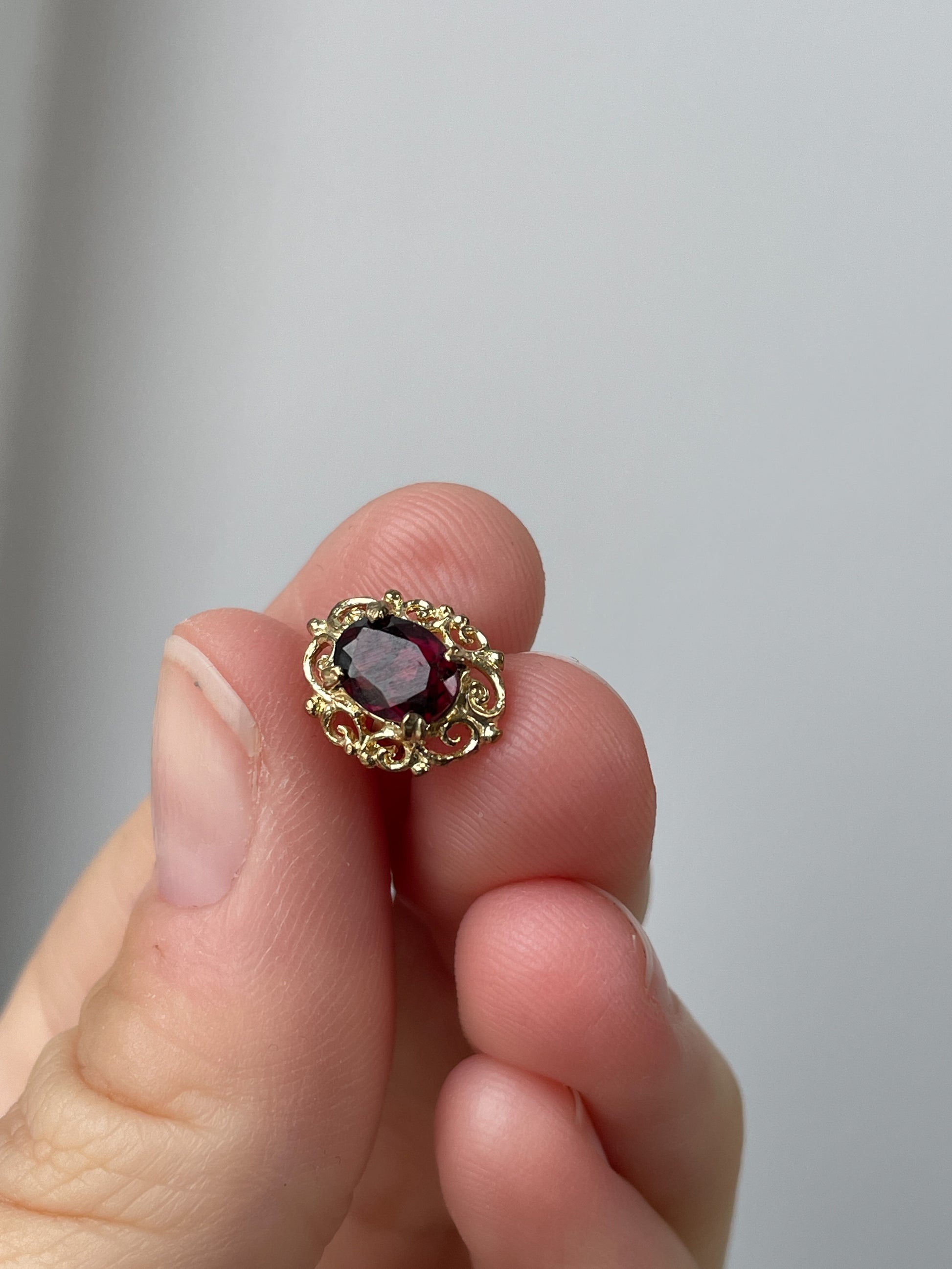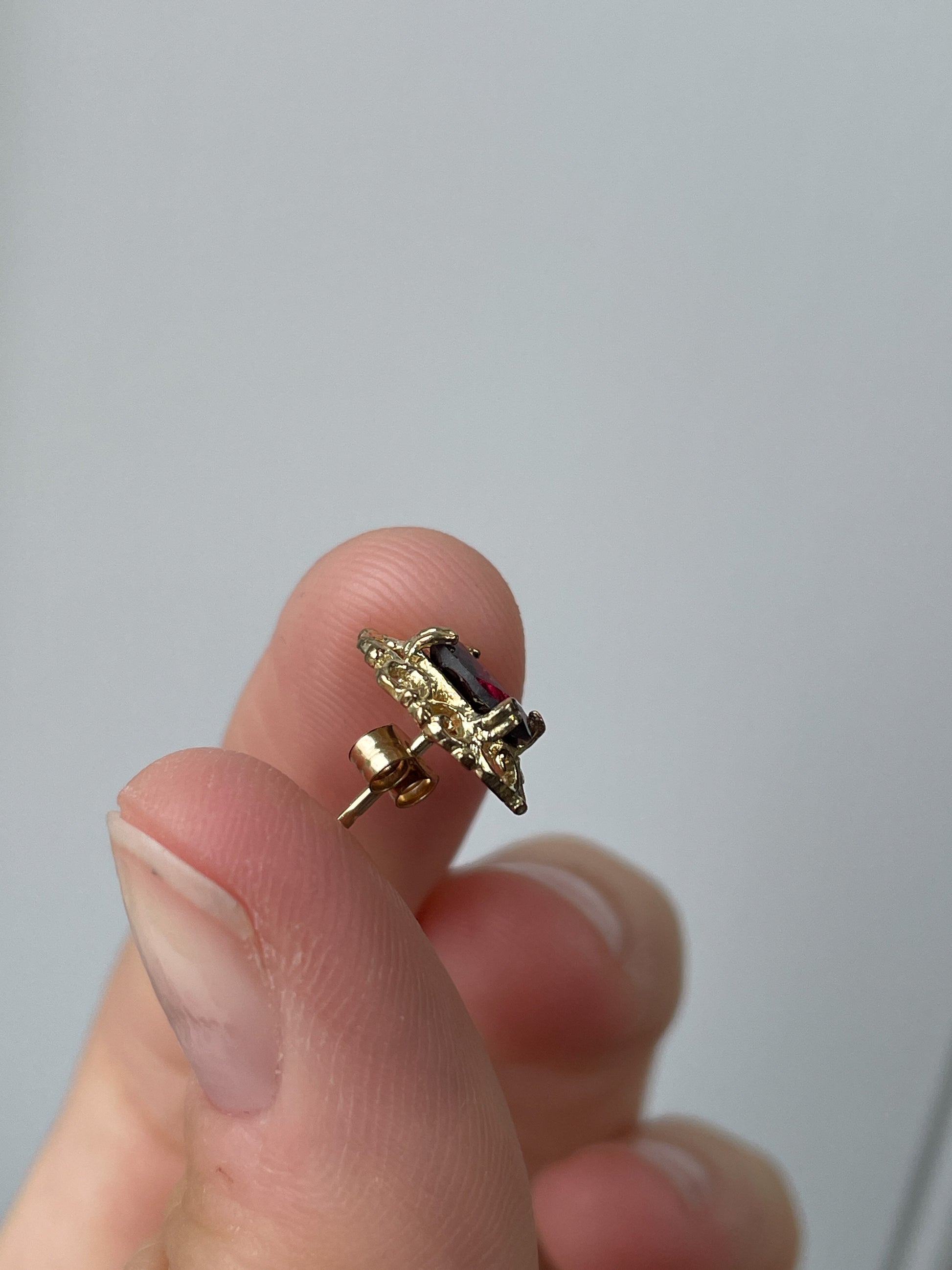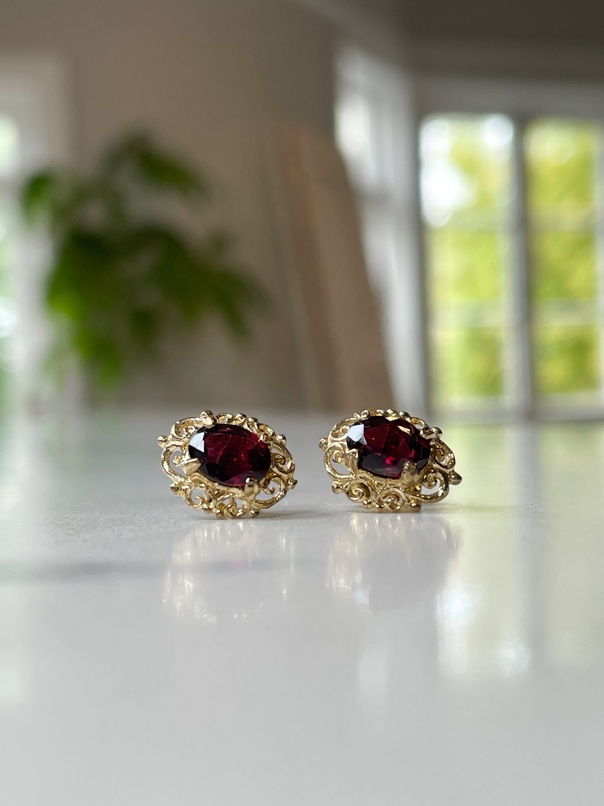 These earrings each have an oval cut garnet stone with a deep berry red hue, surrounded by an ornate open work framing, in 9ct gold.