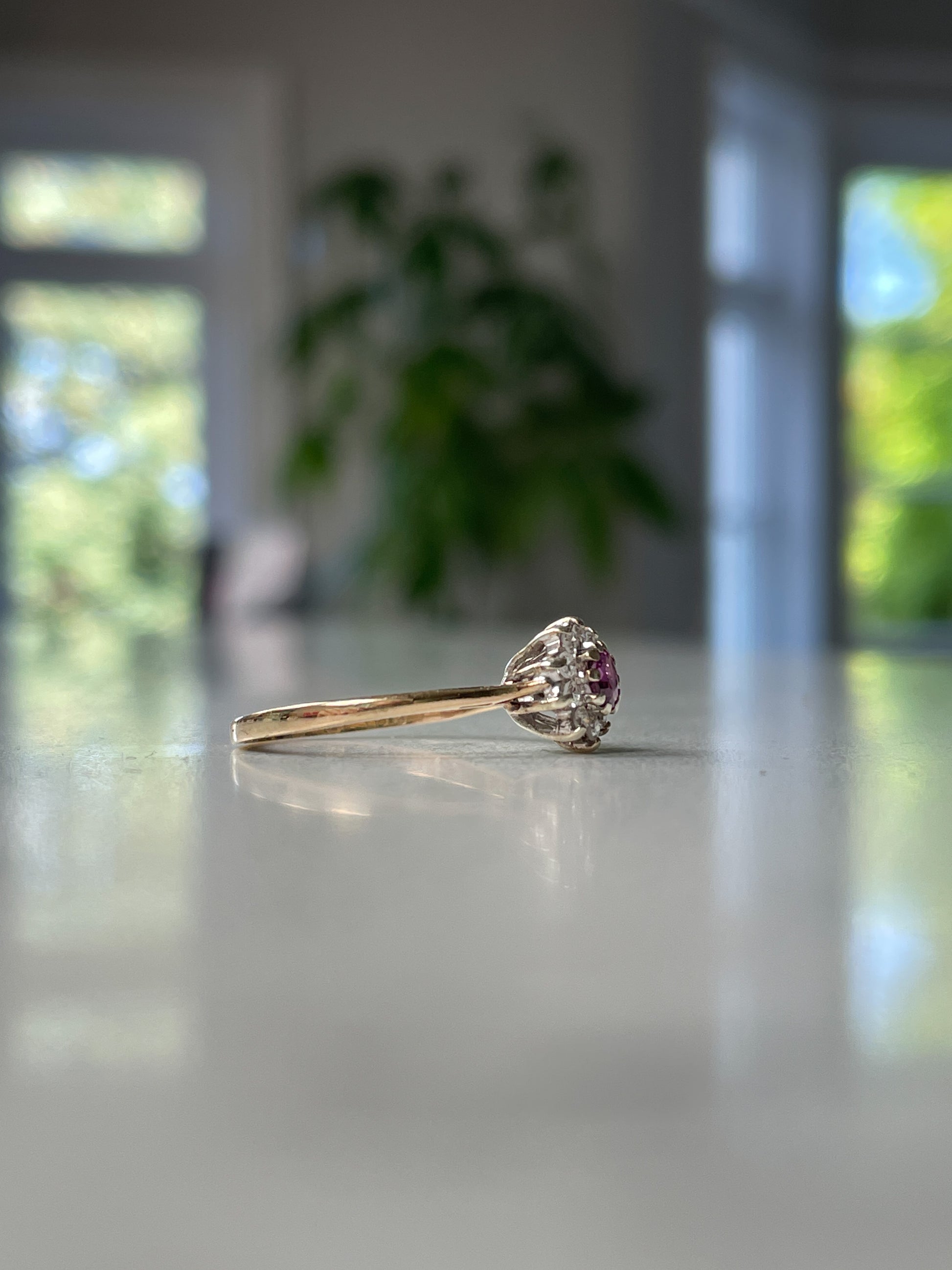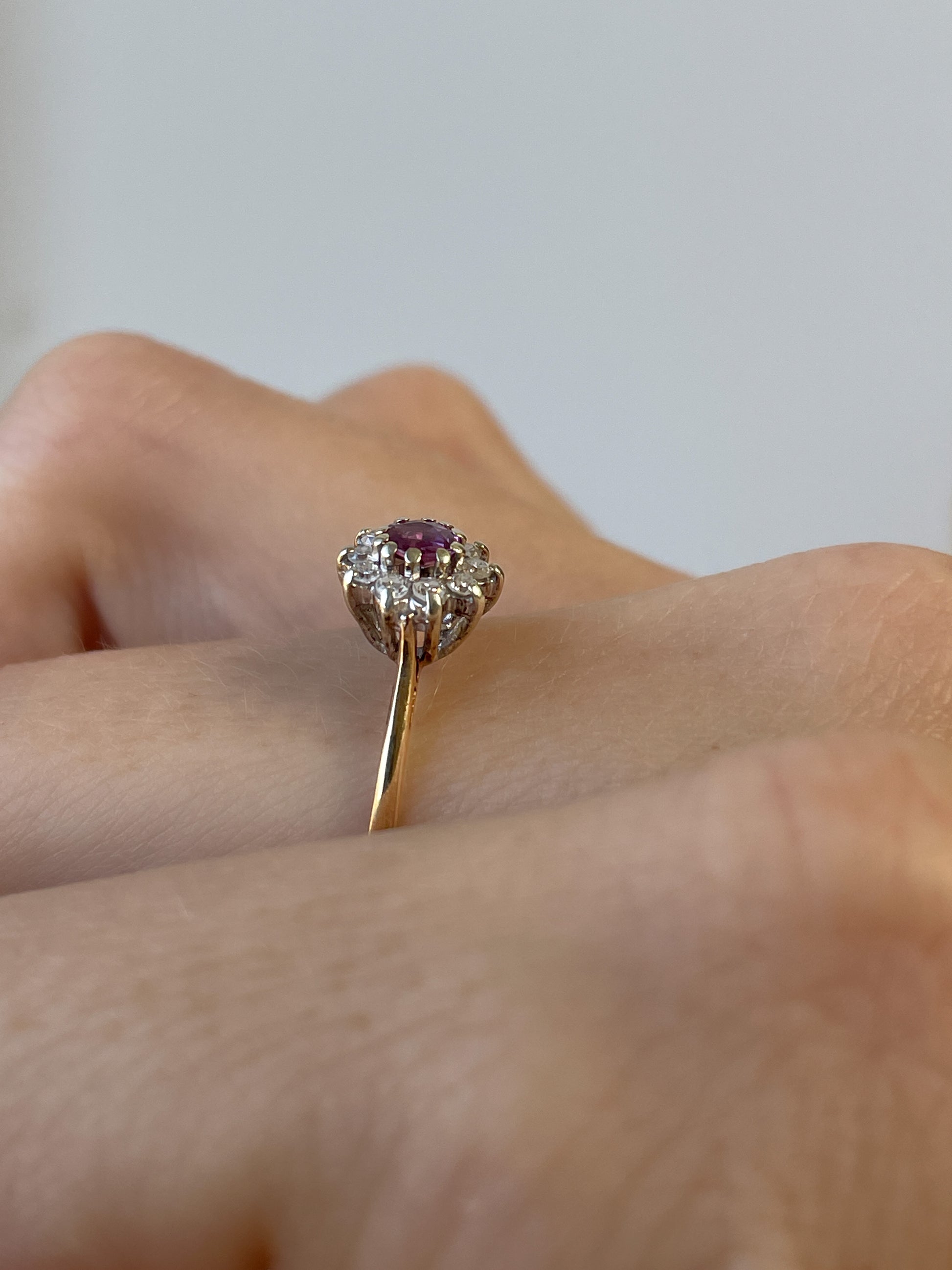 This dainty piece has a gorgeous round cut pinky/purple ruby stone, surrounded by a halo of gorgeous diamonds; 10 in total. It has an overall very pretty round shape to the ring head, almost floral in style and very dainty.
