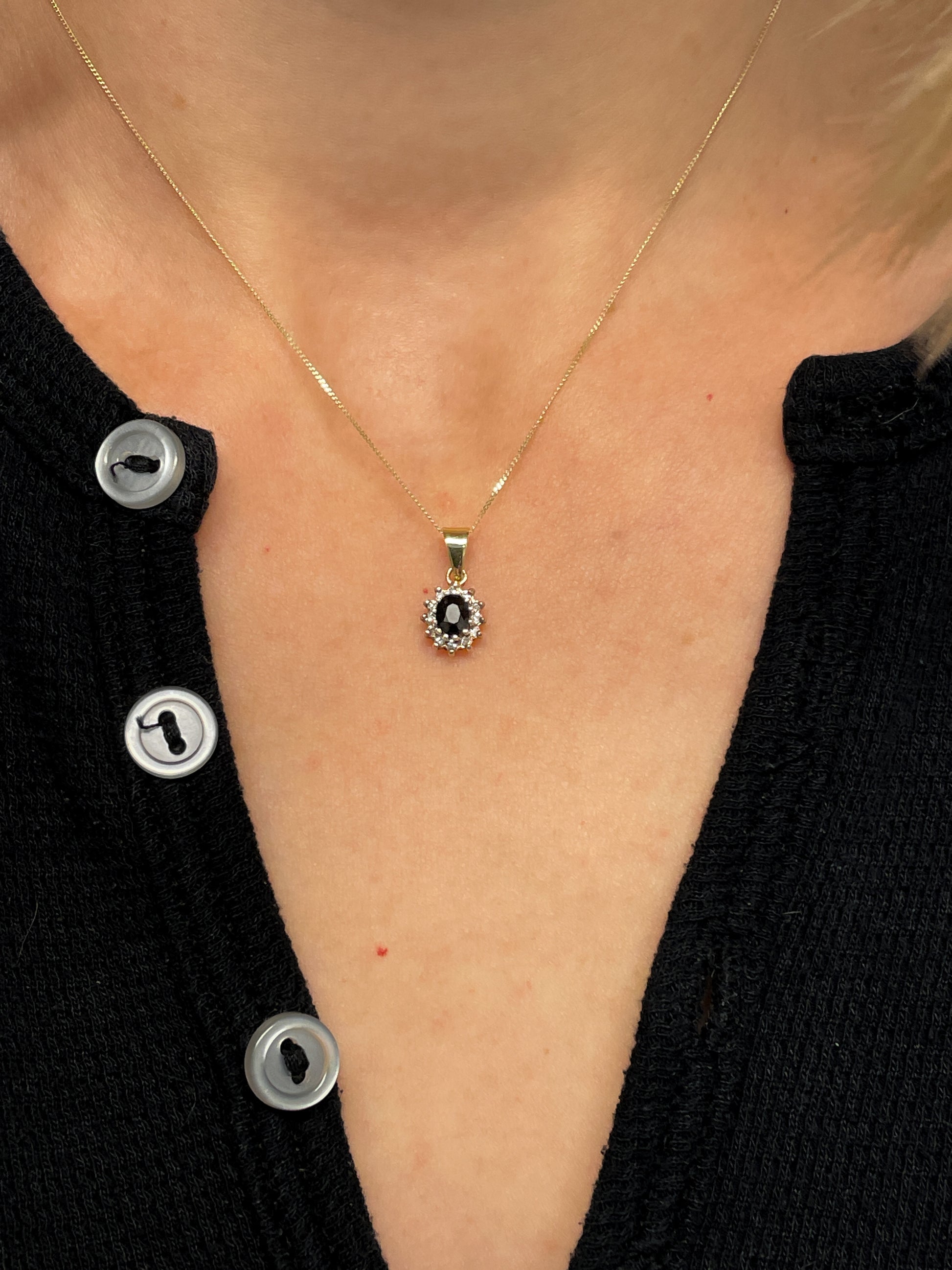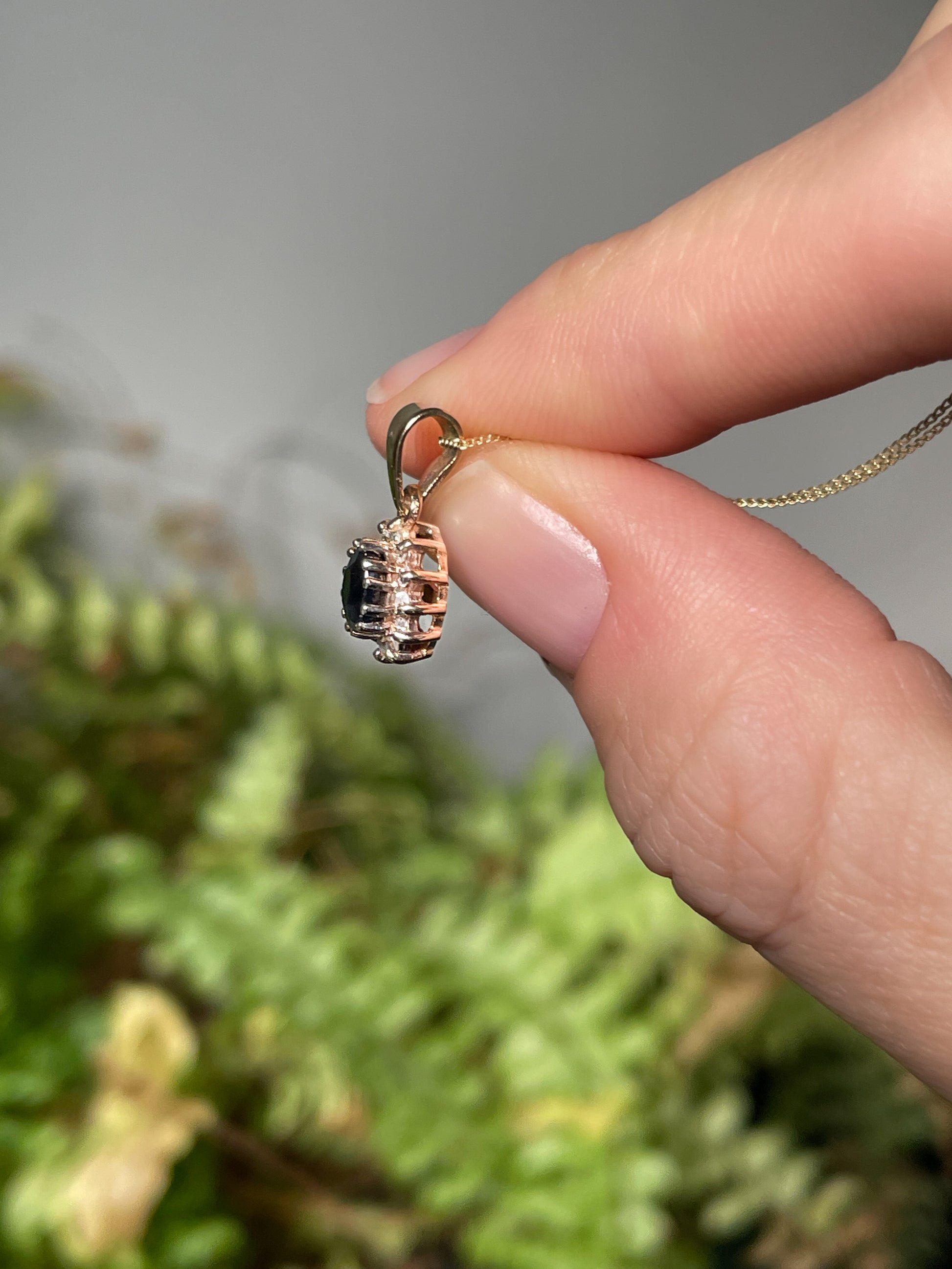 This pendant features a beautiful deep blue sapphire stone surrounded by 12 accent diamonds for added sparkle. Unmarked but tests as 9ct gold.