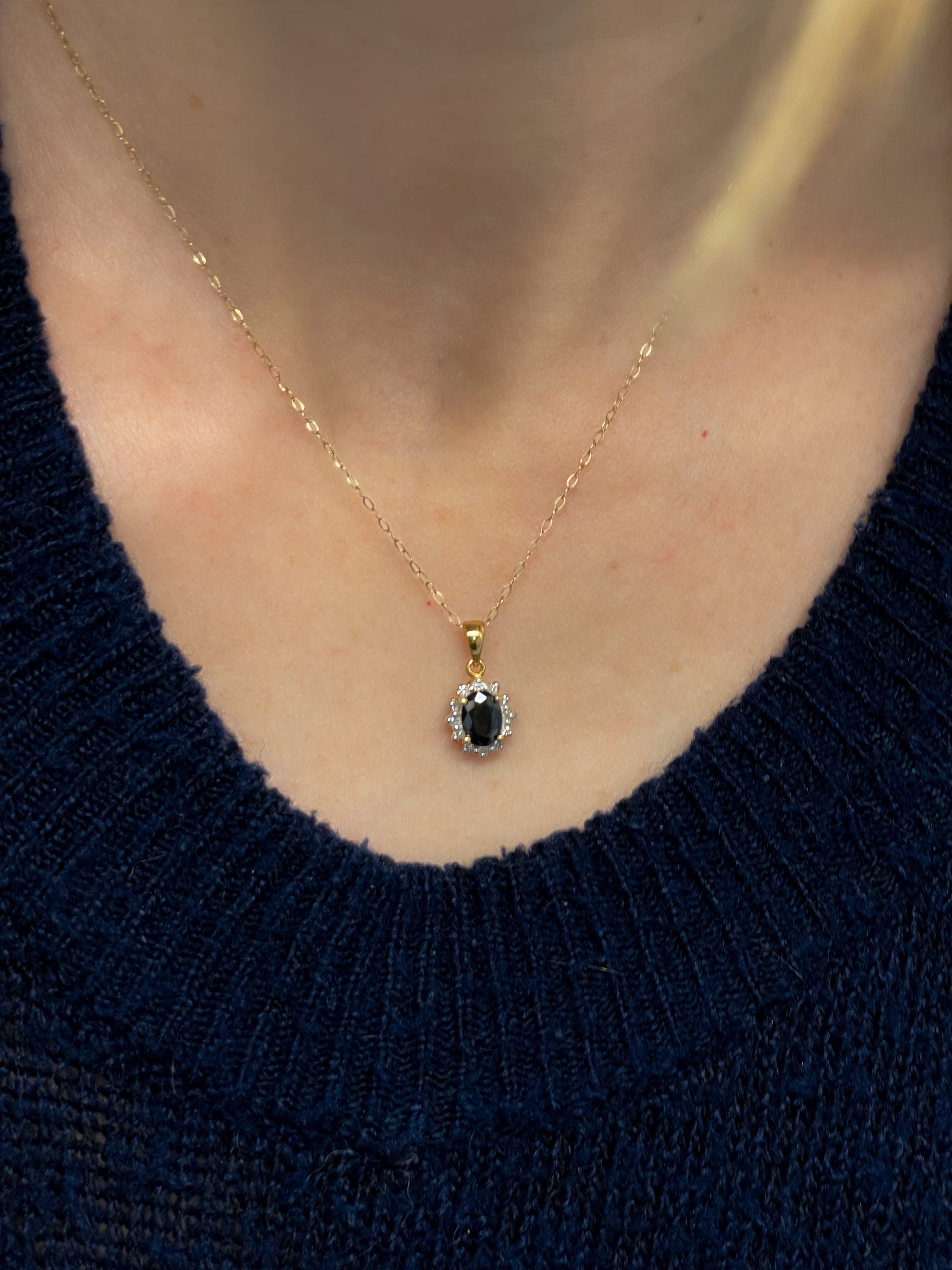 This classic style necklace features a .65ct brilliant cut oval shaped blue sapphire stone, surrounded by a halo of 12 accent diamonds, all set in 9ct yellow gold, with white gold claws. The stone is in very good condition.