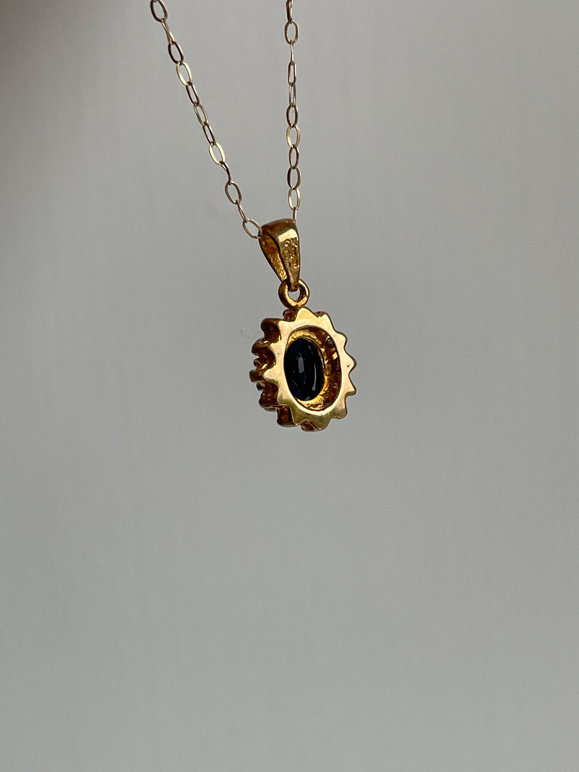 Vintage sapphire and diamond halo cluster pendant and 9ct gold chain